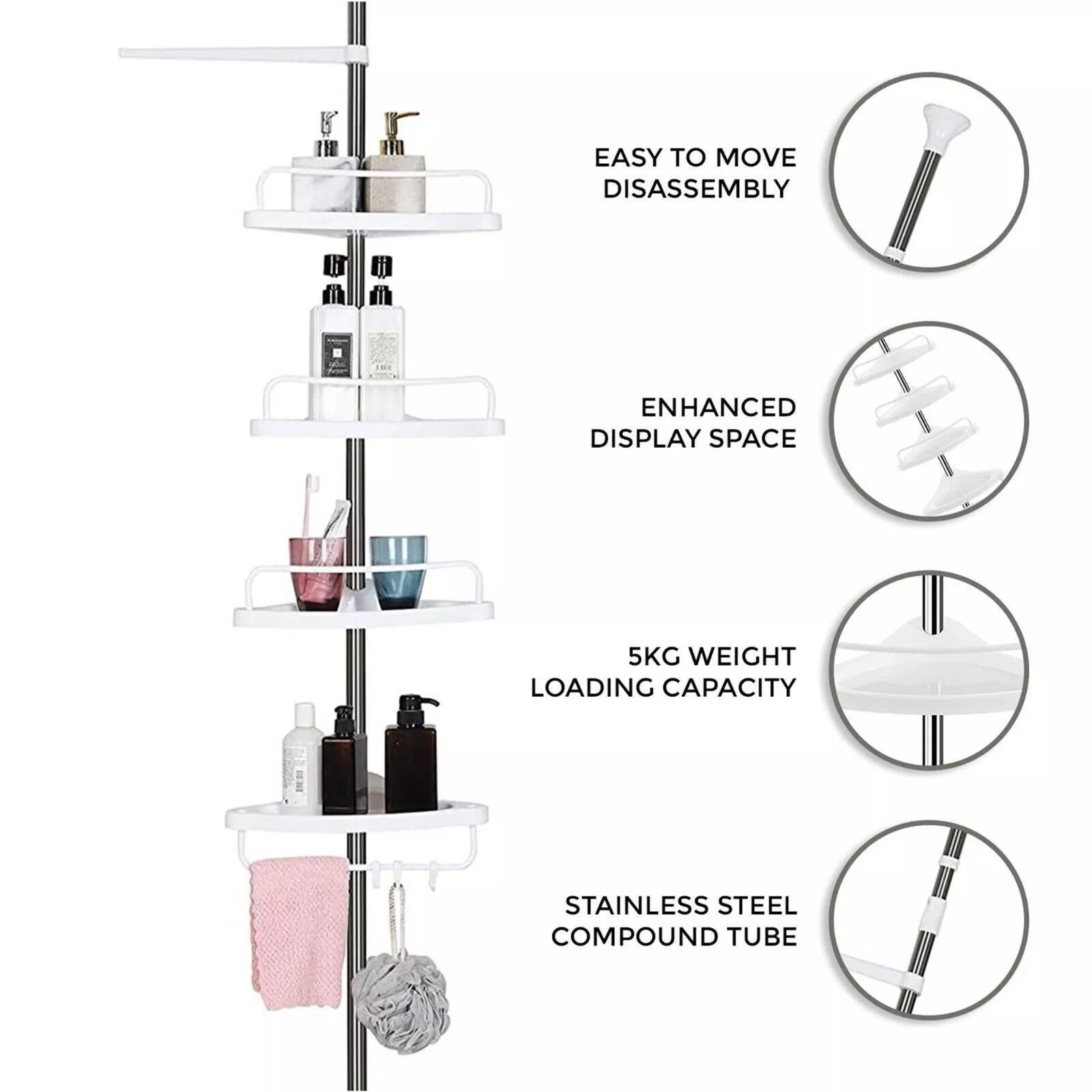 Introducing our 4 tier telescopic bathroom wall corner shelf rack, the perfect solution for maximizing your bathroom space. This shower caddy storage organizer is designed to fit in tight spaces, making it ideal for small bathrooms or those with limited storage space.