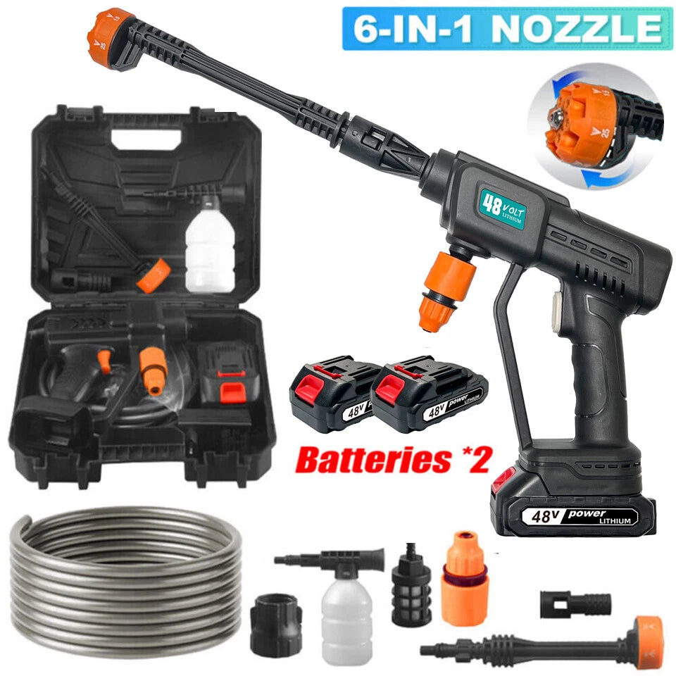 Three kinds of nozzles and application range: This Cordless Pressure Washer is equipped with 6 in 1 nozzle, high pressure nozzle and low pressure nozzle. The 6-in-1 nozzle has 0 °,10 °, 15 °, 25 °, 40 °, and shower mode. It is suitable for outdoor cleaning, such as car cleaning, garden cleaning, swimming pool cleaning, window cleaning and garden watering.
