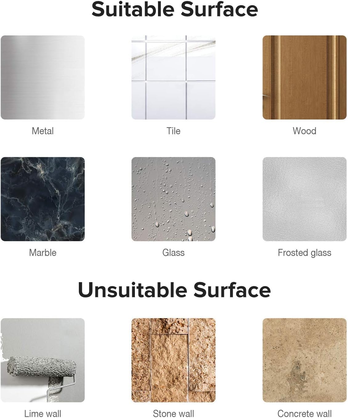 The ilikable suction holder adheres to a range of smooth, flat, non-porous surfaces, including ceramic tiles, glass, mirrors, granite, stainless steel, acrylic, and laminate. It is not suitable for use on porous or rough surfaces. To ensure optimal adhesion, ensure there is no air trapped between the suction cup and the surface during installation, guaranteeing long-lasting performance.