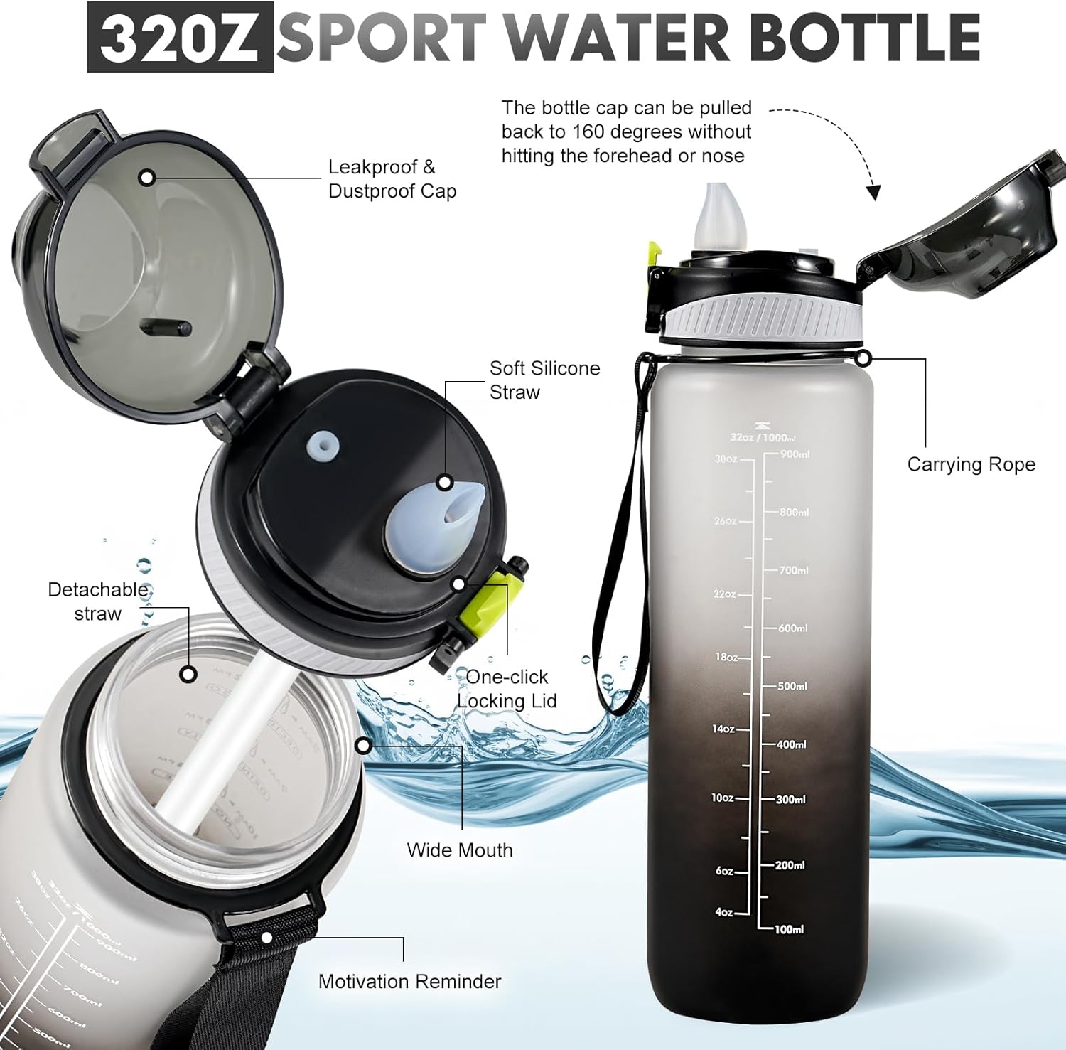 Designed for 100% leak-proof and dustproof performance, the 32 oz water bottle features a sealed silicone ring within the cap to prevent leaks. The innovative flip-top design, with a built-in safety lock and double-layer protection, ensures your bottle remains securely closed, keeping both water and dust where they belong. With the ability to open with just one hand, this bottle offers ultimate convenience, making hydration effortless.